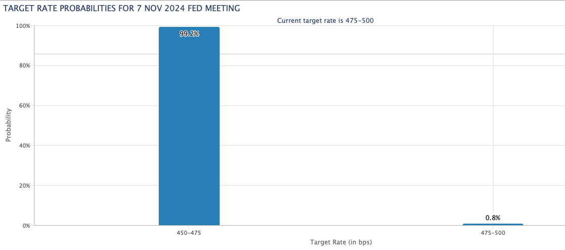 According to the CME FedWatch tool, there is a 99.2% that the Fed will lower the target rate today by 0.25%.